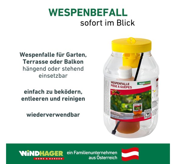 Während der Sommermonate können Wespen einen entspannten Aufenthalt im Freien erschweren. Besonders für Allergiker ist dann Vorsicht geboten. Mit der praktischen Wespenfalle von Windhager kann ein Befall durch Wespen schnell und einfach ermittelt und weitere Maßnahmen ergriffen werden.