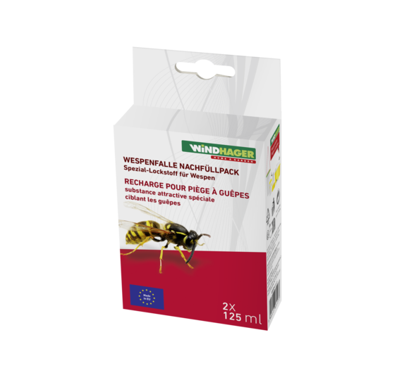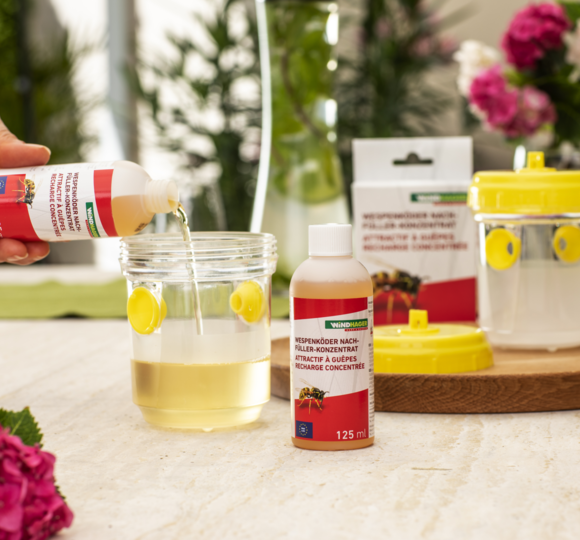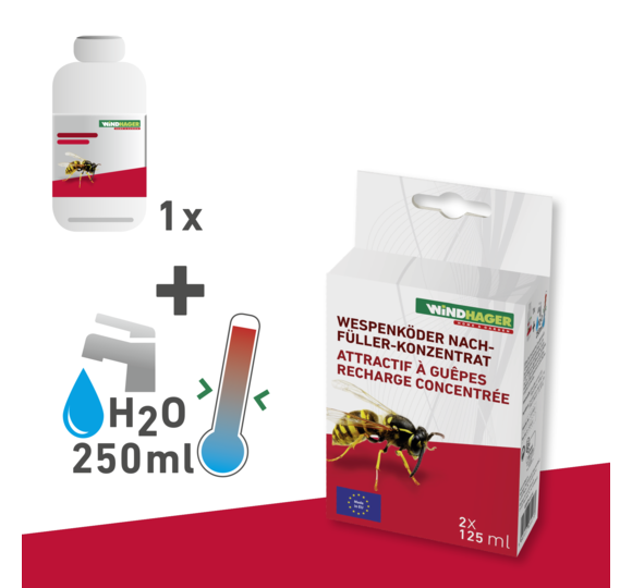 Befüllen Sie eine Falle von Windhager im Verhältnis von 1:2 mit Wespenköder und Wasser (1 Teil Wespenköder, 2 Teile Wasser). Danach ist die Falle direkt einsatzbereit und kann platziert werden. Nach ungefähr drei Wochen sollte der Köder erneuert werden, da er im Laufe der Zeit an Wirksamkeit verliert.