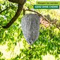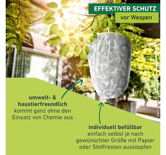 Bei der Wespennest-Attrappe handelt es sich um einen weichen Vliesbeutel mit Nest-Imitat-Aufdruck. Dieser kann einfach selbst mit Stoffresten oder Papier (nicht im Lieferumfang enthalten) ausgestopft und in Form gebracht werden. Anschließend kann die Attrappe an der Kordel zugezogen und an der gewünschten Stelle mithilfe des Aufhängers befestigt werden. Je nach Füllzustand hat die Attrappe eine Größe von circa 20 x 20 x 35 cm und kann wiederverwendet werden.