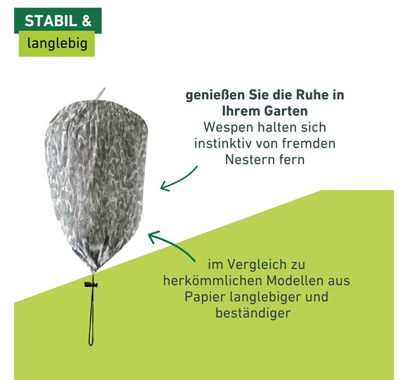 Mit der Wespennest-Attrappe halten Sie die störenden Insekten von Ihrem Garten, Ihrer Terrasse oder Ihrem Balkon fern, ohne Chemie einsetzen zu müssen. Das Eindringen in artgleiche Reviere wird unter Wespen strikt vermieden. Stoßen Wespen also auf ein fremdes Nest, so flüchten sie instinktiv und suchen sich einen anderen Platz für den Nestbau. Dieses Prinzip funktioniert auch mit der Attrappe, sie signalisiert den Wespen, dass hier bereits ein anderer Schwarm beheimatet ist und schlägt sie in die Flucht. Diese natürliche Art der Wespenvertreibung ist nicht nur äußerst effektiv, sondern auch umwelt- und tierfreundlich.