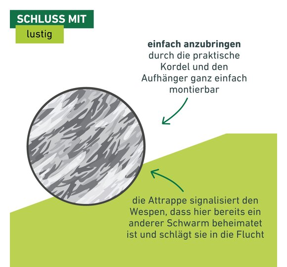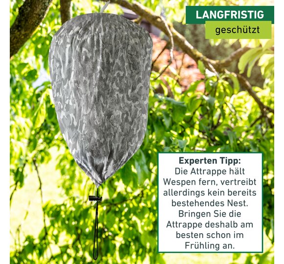 Die Attrappe hält Wespen fern, vertreibt allerdings kein bereits bestehendes Nest. Bringen Sie die WASP AWAY Attrappe deshalb am besten schon im Frühling an. Damit Ihnen die Wespennest-Attrappe möglichst lange erhalten bleibt, empfiehlt es sich, diese an einer trockenen Stelle anzubringen. Außerdem sollte die Attrappe mit einer kurzen Schnur befestigt werden, damit sie auch bei Wind beständig am Platz bleibt.