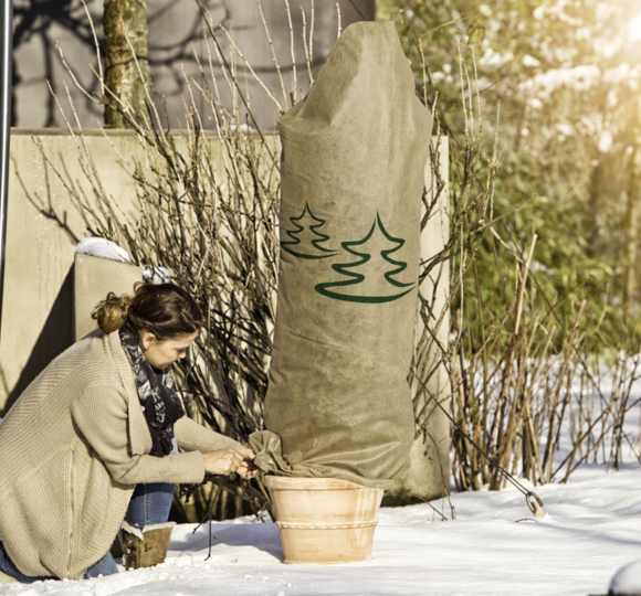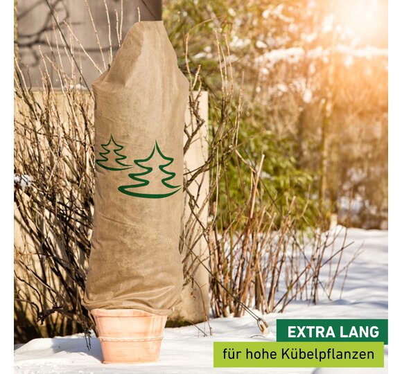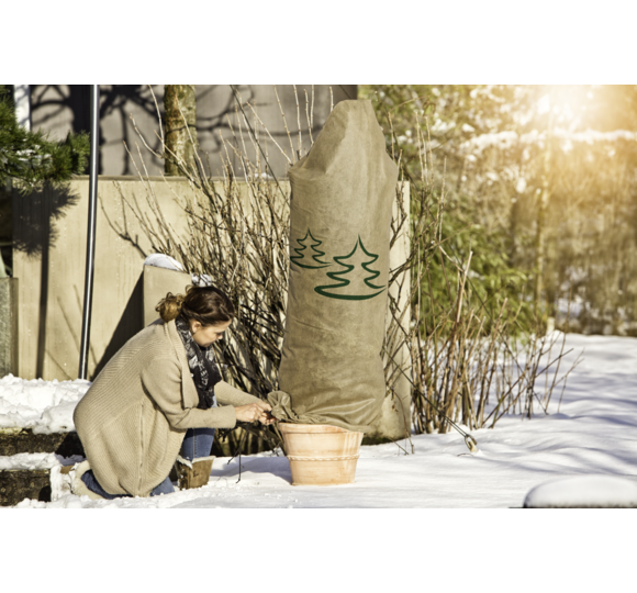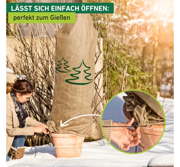 Wenn der Winter vor der Tür steht, ist es Zeit, die Pflanzen im Garten auf die kalte Jahreszeit vorzubereiten. Diese Vlieshaube hilft dabei, Ihre Sträucher, Topfpflanzen und (Jung)-Bäume vor Frost zu schützen und schafft zusätzlich einen dekorativen Hingucker im winterlichen Garten. Die Haube mit Tannenmotiv ist in drei verschiedenen Größen erhältlich, somit ist sie zum Schutz von großen und kleineren Pflanzen geeignet. Dank der integrierten Kordel lässt sich die Vlieshaube ganz einfach über die Pflanze legen und unten zuziehen. Einmal angebracht, schützt sie den ganzen Winter lang vor Frostschäden und Austrocknung durch kalten Wind. Das wasser- und luftdurchlässige Material sorgt für idealen Luftaustausch, während das Wasser im Inneren langsamer verdunstet. Zudem wurde die Vlieshaube mit einem UV-Stabilisator versetzt, welcher das Vliesmaterial länger haltbar macht.