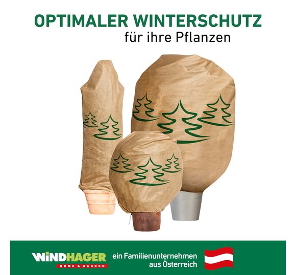 Eine Vlieshaube hilft dabei, Topfpflanzen, (Jung-)Bäume und Sträucher im Garten während der kalten Jahreszeit vor Frost und Wind zu schützen. Im späten Herbst, kurz bevor der Winter einkehrt, gilt es die Pflanzen gut einzupacken. Zweige und sperrige Pflanzen können, vor Anbringung des Winterschutzes, mit einer Schnur, wie zum Beispiel dem Kokos-Baumanbinder von Windhager, zusammengebunden werden. Die Vlieshaube wird danach einfach von oben über die Pflanze gegeben und mithilfe der Kordel unten zugezogen – schon kann der Winter kommen. Die Vlieshaube kann bis zum Frühjahr auf der Pflanze bleiben. Achten Sie darauf, dass die gesamte Pflanze bedeckt ist und keine Zweige oder Blätter mehr sichtbar sind. Bei Kübelpflanzen sollte auch der Topf geschützt werden. Das funktioniert schnell und unkompliziert mit dem Windhager-Topfschutz. Für rundum gut geschützte Pflanzen können Sie den Topf zusätzlich auf eine Topfunterlage stellen.