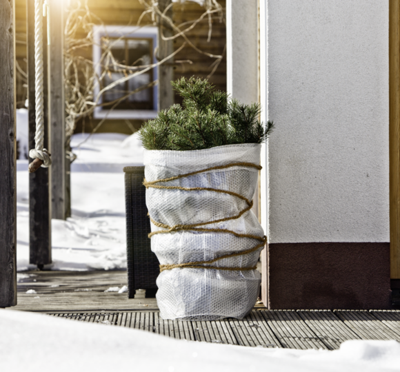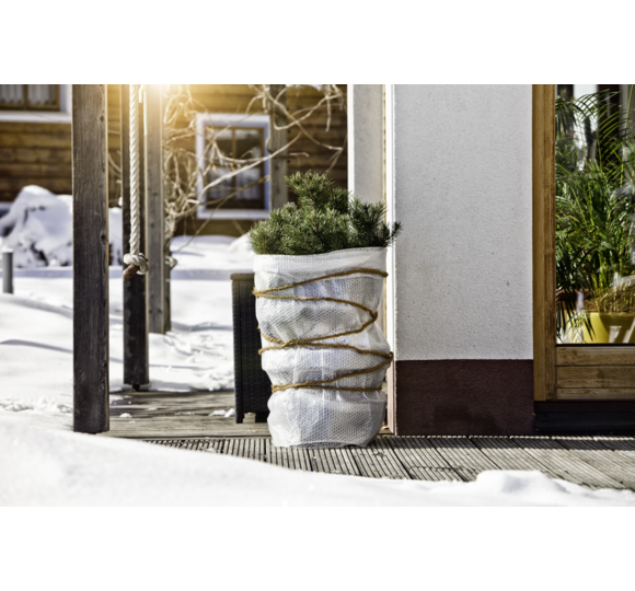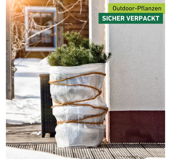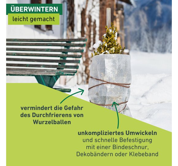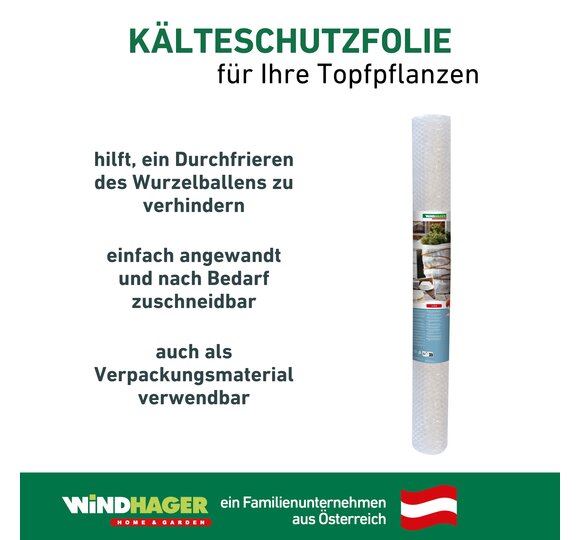 Eine Kälteschutzfolie hilft dabei, Topfpflanzen während der kalten Jahreszeit vor Frost zu schützen. Im späten Herbst, kurz bevor der Winter einkehrt, gilt es die Pflanzen gut einzupacken. Die Noppenfolie wird dabei um Pflanztöpfe gewickelt, um die Gefahr des Durchfrierens der Wurzelballen zu vermindern. Um auch die Zweige der Pflanzen zu schützen, sollten Sie die Pflanzen stets zusätzlich mit einem anderen Winterschutzprodukt, wie zum Beispiel einem Wintervlies oder einer Vlieshaube, verhüllen. Passendes Bindezubehör finden Sie ebenfalls im Windhager-Sortiment. Für rundum geschützte Pflanzen können Sie den Topf zusätzlich auf eine Topfunterlage stellen.