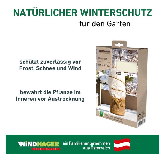 Dieses Winterschutzprodukt bietet die Vorteile eines klassischen Winterschutzes: es hilft dabei, Frostschäden zu verhindern und schützt vor Austrocknung durch Kälte, Wind und Sonne. Das Wintervlies lässt sich schnell um die Pflanzen wickeln und kann anschließend mit einer Bindeschnur, wie zum Beispiel aus Jute oder Schafwolle, aus dem Windhager-Sortiment befestigt werden. Das Vlies bietet mit einer Grammatur von 50 g/m2 guten Schutz bei kalten Temperaturen.