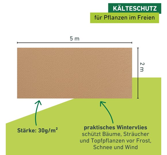 Damit Ihre Pflanzen die kalten Temperaturen im Winter gut überstehen, müssen sie richtig geschützt werden. Egal ob auf Terrasse, Balkon oder im Garten, überall dort, wo es kalt wird, brauchen Ihre Pflanzen besonderen Schutz. Dieses Wintervlies hilft dabei, Bäume, Sträucher und Topfpflanzen gut durch die kalte Jahreszeit zu bringen. Wasser- und luftdurchlässiges Material sorgt für langsamere Verdunstung von Wasser im Inneren und bewahrt die Pflanzen somit vor dem Austrocknen durch Wind, Frost oder Sonne. Auch Schäden durch Wildverbiss lassen sich auf diese Weise verhindern. Das Vlies mit 30g/m2 ist in zwei Größen erhältlich und kann bei Bedarf individuell mit einer Schere zugeschnitten werden. So kann es besonders gut an Baumkronen und Co angepasst werden.