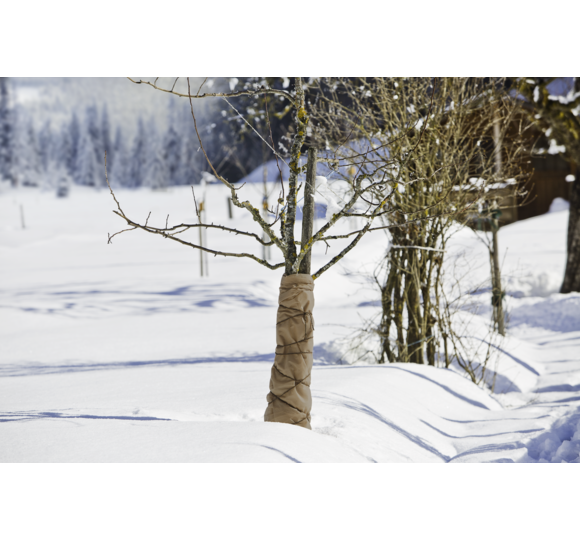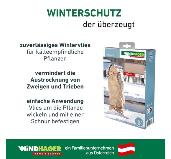 Ein Wintervlies hilft dabei, Topfpflanzen, (Jung-)Bäume und Sträucher im Garten während der kalten Jahreszeit vor Frost und Wind zu schützen. Im späten Herbst, kurz bevor der Winter einkehrt, gilt es die Pflanzen gut einzupacken. Zweige und sperrige Pflanzen können, vor dem Umwickeln mit dem Wintervlies, mit einer Schnur, wie zum Beispiel dem Kokos-Baumanbinder von Windhager, zusammengebunden werden. Danach klappt das Umwickeln mit dem Wintervlies schnell und unkompliziert. Achten Sie darauf, dass die gesamte Pflanze bedeckt ist und keine Zweige oder Blätter mehr sichtbar sind. Für optimalen Schutz sollte das Vlies mehrmals um die gesamte Pflanze gewickelt werden. Befestigen Sie das Wintervlies anschließend zum Beispiel mit einer Bindeschnur, damit die Pflanzen den ganzen Winter über zuverlässig geschützt bleiben. Passendes Bindezubehör finden Sie ebenfalls im Windhager-Sortiment. Bei Kübelpflanzen sollte auch der Topf geschützt werden. Das funktioniert schnell und unkompliziert mit dem Windhager-Topfschutz. Für rundum gut geschützte Pflanzen können Sie den Topf zusätzlich auf eine Topfunterlage stellen.