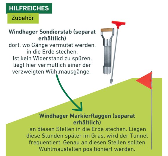 Mit dem Windhager Sondierstab VOLE TRAP ACCESSORIES (Art.-Nr. 05316) dort, wo Gänge vermutet werden, in die Erde stechen. Ist kein Widerstand zu spüren, liegt hier vermutlich einer der verzweigten Wühlmausgänge. Diese Stellen mit den Windhager Markierflaggen (Art.-Nr. 05317) markieren. Liegen diese Stunden später im Gras, wird der Tunnel frequentiert. Genau an diesen Stellen sollten Wühlmausfallen positioniert werden.
