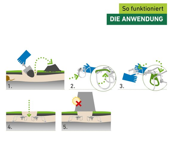 Nachdem ein Wühlmausgang ausfindig gemacht wurde, muss die Falle nur noch platziert werden. Die Falle BRACKET sollte ungefähr 10 cm unter der Erdoberfläche gesetzt werden. Danach muss das Loch wieder verdeckt werden. Hierfür eignet sich beispielsweise die zuvor entfernte Grasnarbe oder ein Eimer. Zusätzlich kann die Stelle an der sich die Falle befindet mit einer Markierflagge (Art.-Nr. 05317) gekennzeichnet werden. So lässt sich die Wühlmausfalle danach wieder leichter finden.