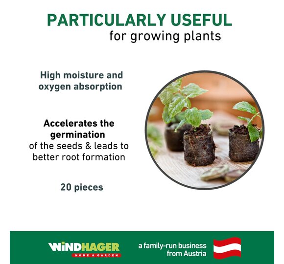 The coconut fibres of the seedling pellets are characterized by increased moisture absorption. This results in the seeds germinating more quickly and enhanced root formation. In this way the plants are encouraged to grow, and may bear fruit sooner. Encased in fine-woven cotton mesh.