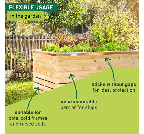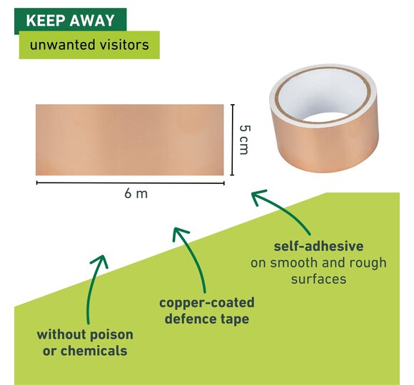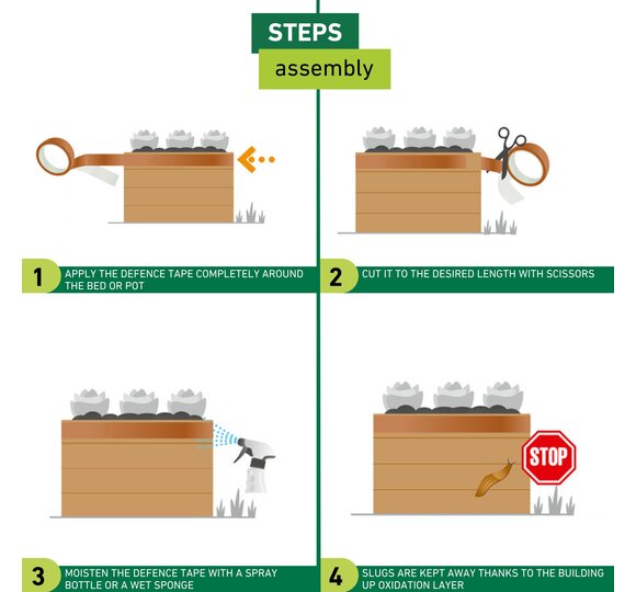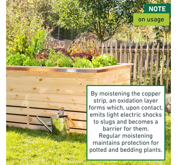Thanks to its adhesive back, the copper strip can be attached to pots, cold frames and raised beds of various sizes quickly and effortlessly while optimally protecting your plants once applied. Once applied, wet the strip to provide for optimum oxidation layer build-up.
