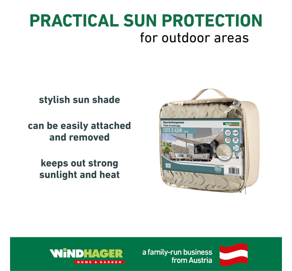 The sun shade COTE D'AZUR ensures pleasant temperatures in summer. The special RIPSTOP fabric is tear-resistant and UV-stabilised. It keeps out strong sunlight and heat.
