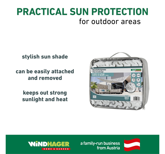 The sun shade COTE D'AZUR ensures pleasant temperatures in summer. The special RIPSTOP fabric is tear-resistant and UV-stabilised. It keeps out strong sunlight and heat.