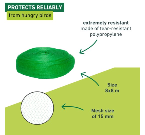 The close-meshed net provides reliable protection against damage caused by bird feeding. It allows fruit to mature, which increases the yield. It is ideal for protecting currant bushes or young seeds against smaller birds such as sparrows.