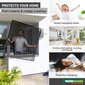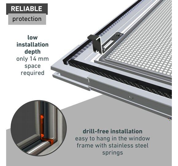 With the sun protection frame window, you can reliably keep sun's rays and mosquitoes away from your home! The drill-free attachment with stainless steel hook-in springs is perfect for rented flats, but also for those who do not want to damage the window frame. The resistant fibreglass flyscreen fabric performs well for many summers; it reduces the heating of the interior and keeps insects out.