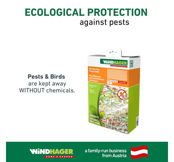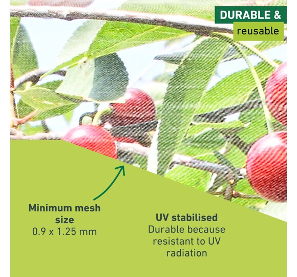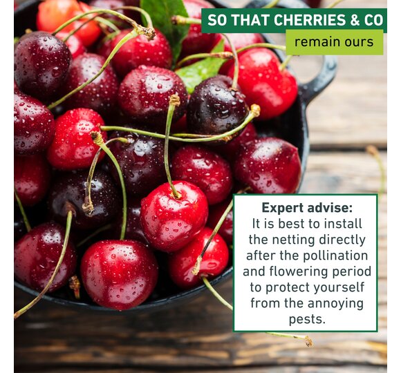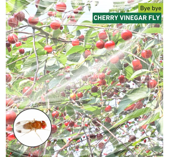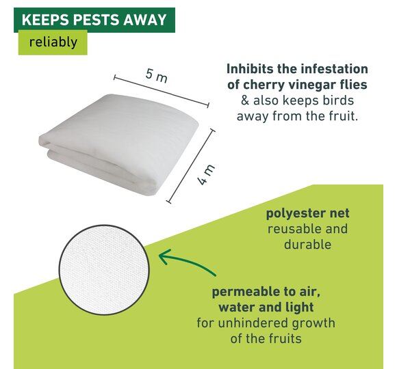 The net effectively protects fruits from fruit trees and bushes from cherry vinegar flies. The finely woven net hinders the tiresome pest from laying it egg in ripe fruits.
