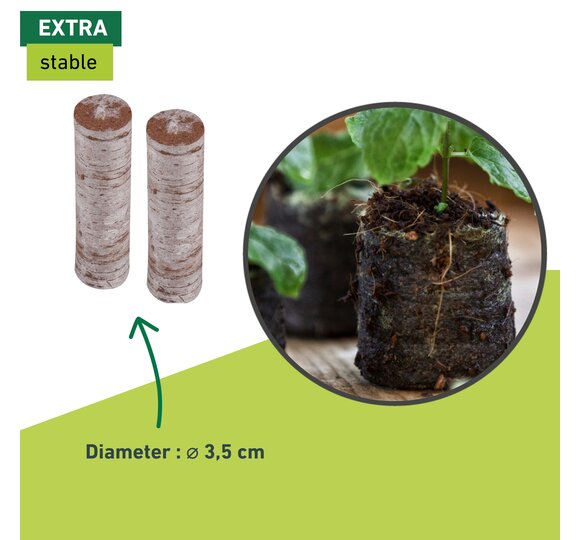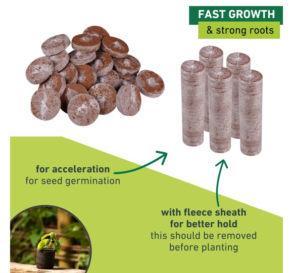 The coconut fibres of the seedling pellets are characterized by increased moisture absorption. This results in the seeds germinating more quickly and enhanced root formation. In this way the plants are encouraged to grow, and may bear fruit sooner. Encased in fine-woven cotton mesh.