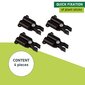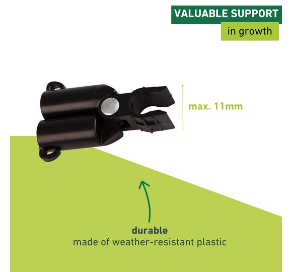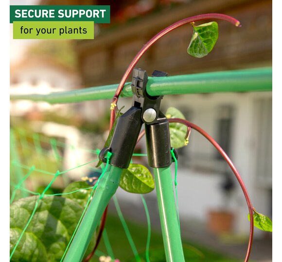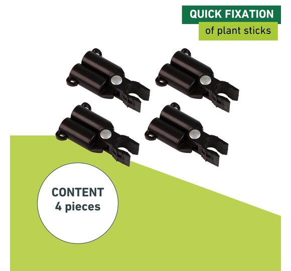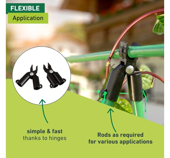 The hinge allows for a particularly fast and easy application. The horizontal rod can simply be clipped in. Additional climbing aids can of course be attached as climbing grids. The set comes with 4 black plastic rod holders.