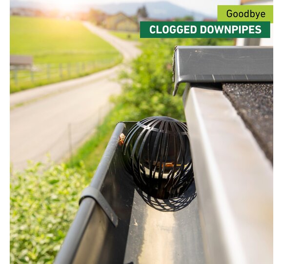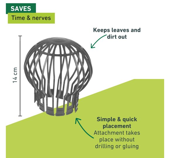Debris in the gutter downpipe is problematic as it can only be cleaned from above - but causes the water in the downpipe to drain off poorly or not at all. This in turn can cause the water to accumulate on the roof and cause damage. The downpipe cover, on the other hand, prevents this by stopping leaves and other debris from entering the pipe.