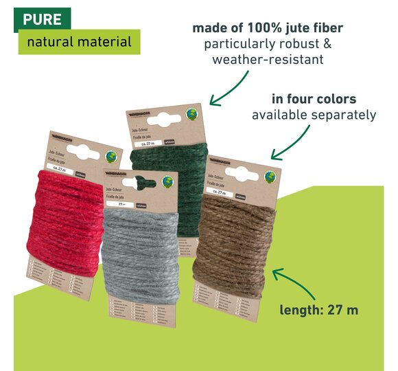 The natural jute fibres’ irregular twist gives the decoration string its particular charm. Available in bright and covered colours.