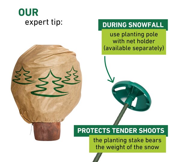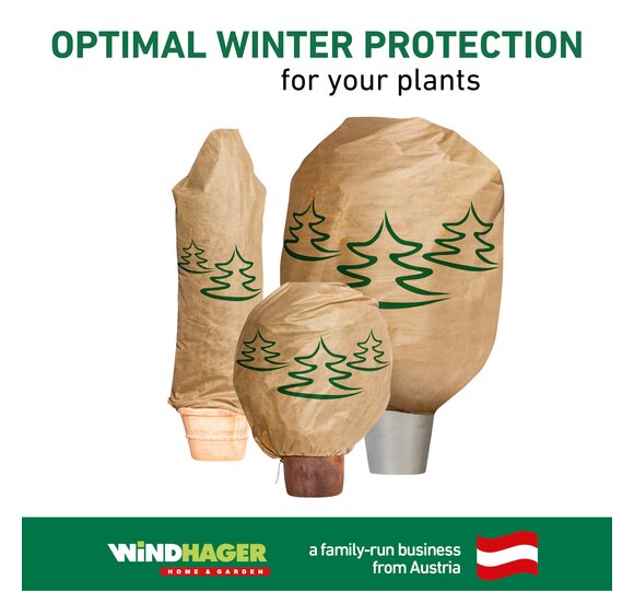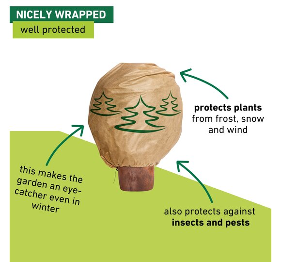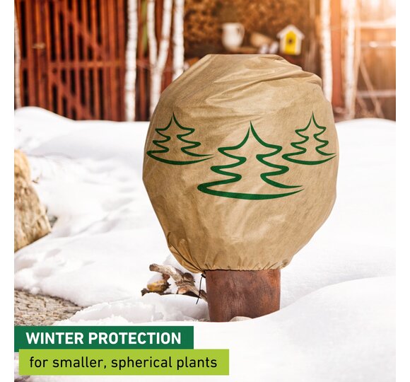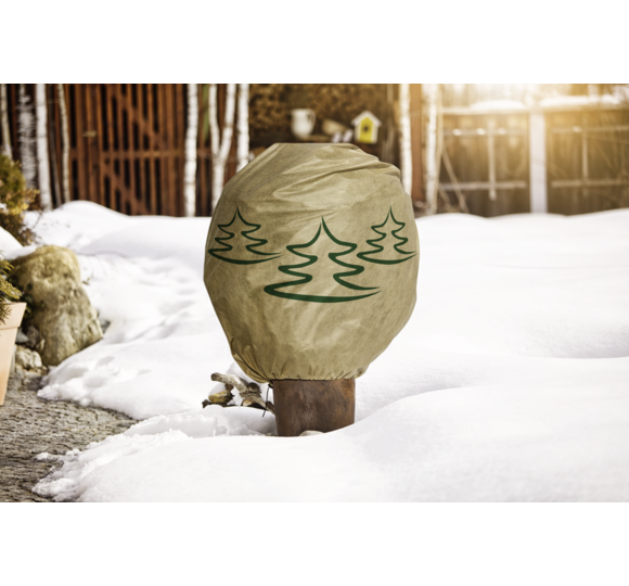 The water and air permeable fleece cover protects shrubs, tubbed and potted plants against frost, wind and snow.
