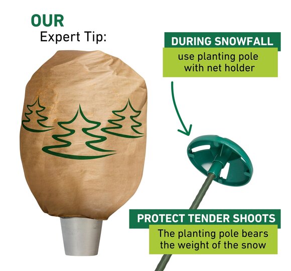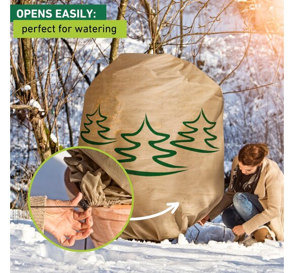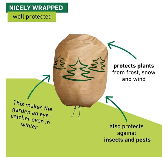 The water and air permeable fleece cover protects shrubs, tubbed and potted plants against frost, wind and snow.