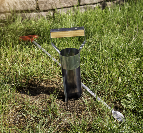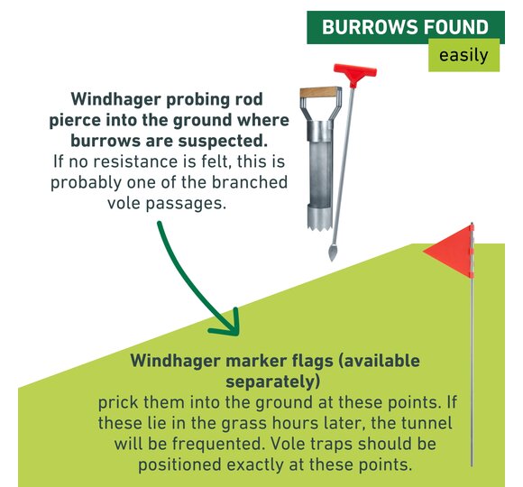 Use the sounding rod (item no. 05316) to dig into the ground where tunnels are suspected to be present. If no resistance can be felt, it is probably one of the branched passages. Mark these places with the Windhager marker flags (item no. 05317, available separately). If the flags are in the grass a few hours later, the tunnel is being used. Traps should be positioned precisely in these places. In order to set the traps, the tunnel must first be exposed. This is where the cutter with the sharp-edged ends comes into play. The cutter allows easy penetration into the corridor, after which a trap can be placed.