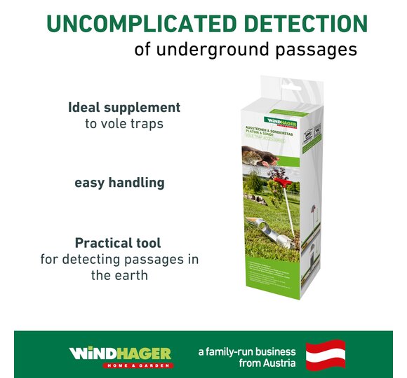 Voles and moles can cause a lot of damage in the garden. Put an end to mounds of soil and bitten roots with the Windhager traps. But in order to lay a trap, the underground tunnels of the animals must first be found. The combination of sounding rod and cutter offers the ideal tool in this regard. With the help of the sounding rod, tunnels can be found, and the high-quality cutter with a sturdy wooden handle enables a subsequent advance to the tunnel in order to be able to set the trap.