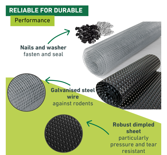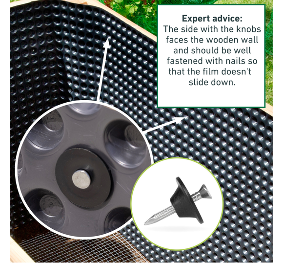 Our tip: Windhager's robust fastening nails (available separately) can be used to securely attach the dimpled film onto raised beds side walls. The plastic washer ensures that the installation point is well sealed and that no water penetrates.