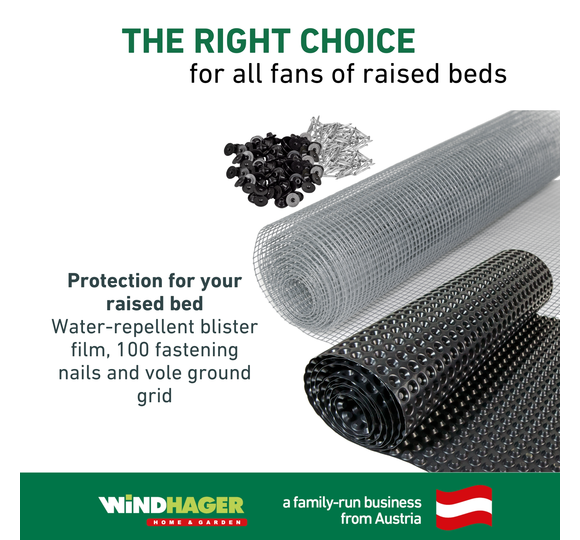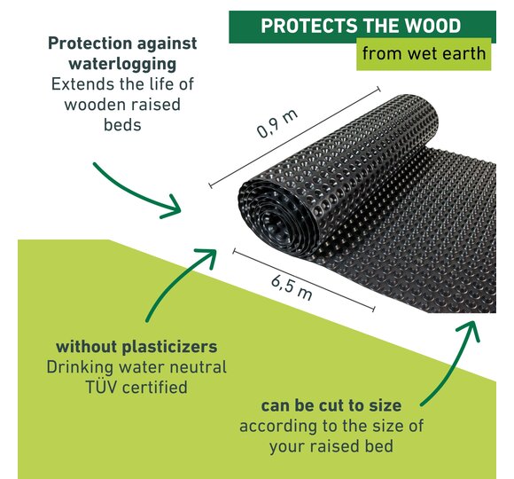The wood of a raised bed is susceptible to damage such as rotting, mould or decay due to constant contact with damp soil and water. However, with the dimpled sheeting for raised beds from Windhager your raised bed will stay in top condition for longer. It effectively protects against waterlogging and contributes to optimum air circulation on the side walls of the raised bed. In addition, it is also tested for harmful substances.