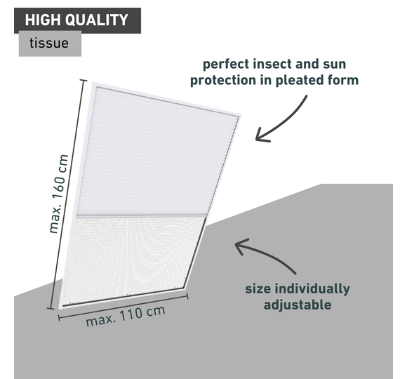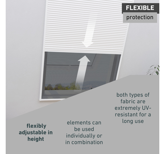 The stable aluminium frame can be freely cut to the desired size, both types of fabric are UV-resistant and will do their job for many summers. Annoying insects are kept out, cool air is kept inside. Well-being guaranteed!