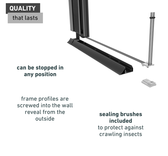 The innovative pleated door can be stopped in any position you desire and is very space-saving. the pleating fabric is particularly hard-wearing and therefore suitable for many years of use. The patented method of positioning the tension line allows for greatly facilitated and user-friendly installation.