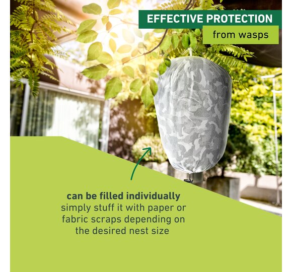 The wasp nest dummy is a soft fleece bag with a print imitating a nest. This can simply be stuffed with scraps of fabric or paper (not included in the scope of delivery) and shaped. The dummy can then be pulled tight on the cord and attached to the desired location using the hanger.  Depending on the filling level, the dummy has a size of approx. 20 x 20 x 35 cm and can be reused.