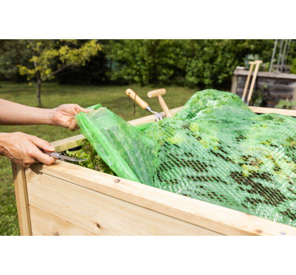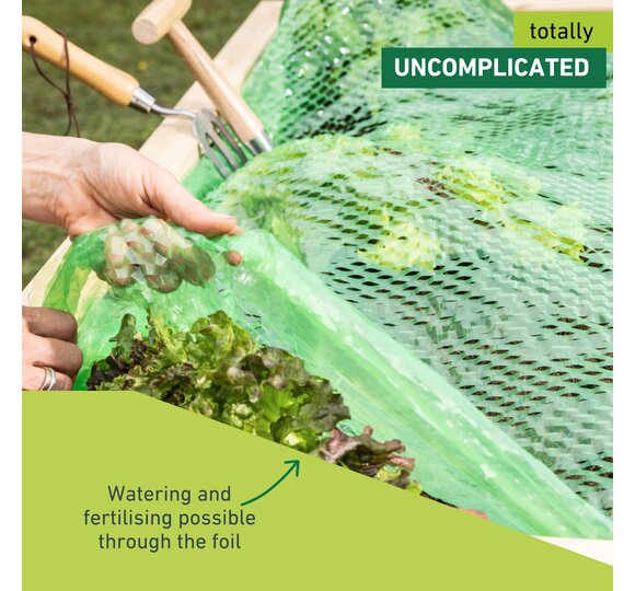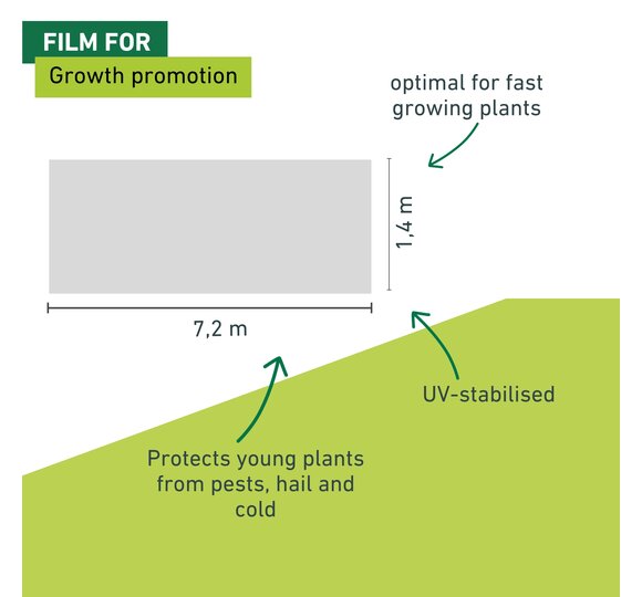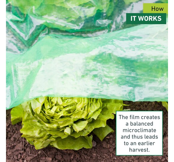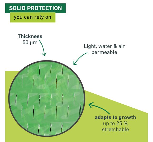 The sheeting can be stretched by up to 25% and, therefore, adjusts to the plants as they grow. It generates a balanced microclimate and promotes an earlier harvest. The plants can be watered and fertilized easily and conveniently through the sheeting.