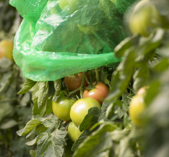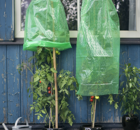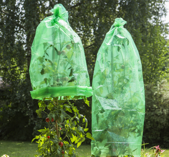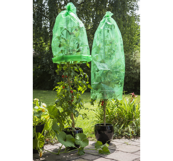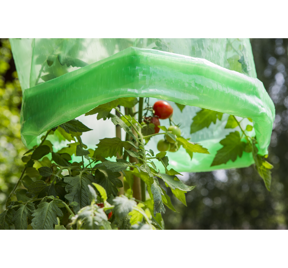 The tomato hood is made of plastic sheeting, which can be stretched up to 25%, and is particularly suitable for high-growing plants such as tomatoes, aubergines and peppers. The hood protects against pests, cold and blight.