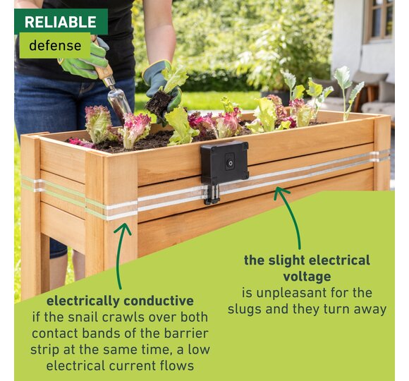 - INSURMOUNTABLE BARRIER - The electrically conductive barrier strip around the raised bed prevents snails from reaching the plants without killing them