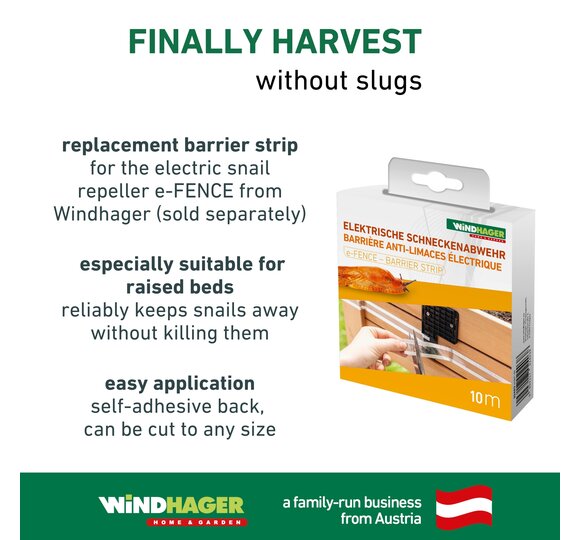 The e-FENCE BARRIER STRIP is a practical replacement barrier strip for the electric snail repellent e-FENCE from Windhager. This conductive strip reliably protects the raised bed on all sides and effectively keeps snails away.