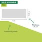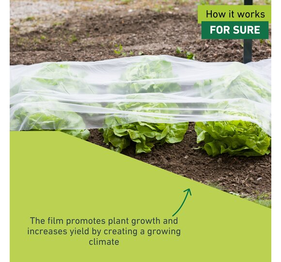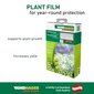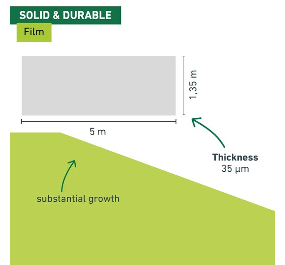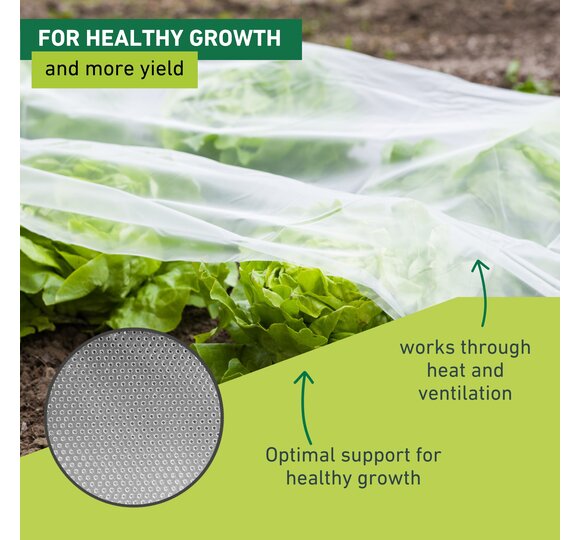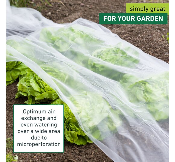 The sheeting encourages plant growth and increases yield by generating a hothouse climate. Optimal air exchange and extensive, even irrigation through microperforation. UV stabilization protects the plants against excessive sun (sunburn).