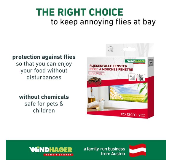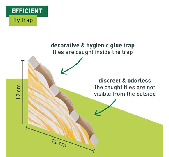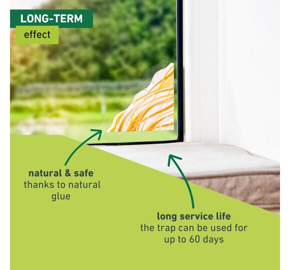 This discrete and – above all – hygienic trap keeps your home free from flies 24/7. Depending on the number of flies and interior temperature, the odourless glue trap lasts up to 60 days. Easily attached to the corner of a window or a balcony door’s glass pane thanks to pre-manufactured double-sided adhesive strip.