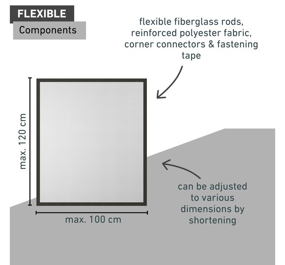 Constructed with a frame made of flexible fibreglass rods, corner connectors and a practical fastening tape, including a cutting template, this insect screen provides an ideal fit for offset windows. The fly screen fabric made of reinforced polyester ensures durability and reliability. Thanks to the flexible fibreglass rods, which can be easily shortened with a saw if necessary, the fly screen can be individually adapted for window sizes up to 100x120 cm. With a required installation depth of just 5 mm, the screen fits seamlessly into your window frame and can be easily removed at any time.