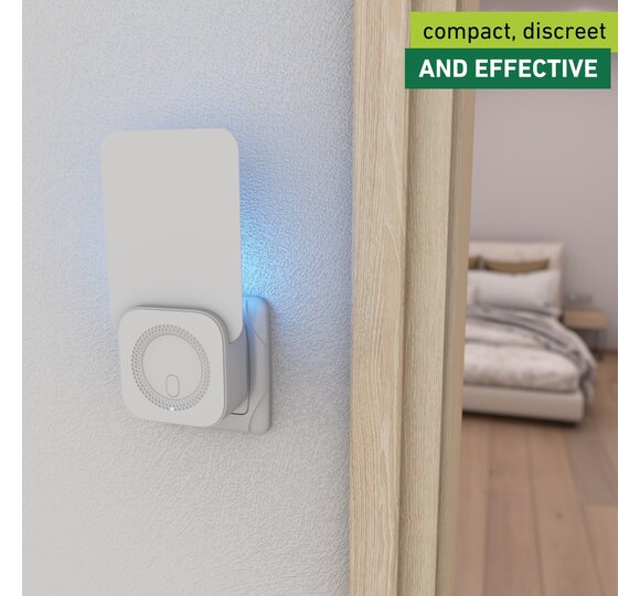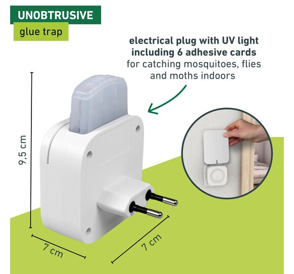 Thanks to the effective UV LED technology, the unwelcome visitors are specifically attracted. As soon as the insects land on the back of the adhesive card, they remain stuck and can discreetly and hygienically be disposed . The inconspicuous adhesive trap works completely without poison and produces no unpleasant odours or noises. It is therefore ideal for the use in living rooms, bedrooms and children's rooms. The compact trap also cuts a fine figure as a practical travelling companion.