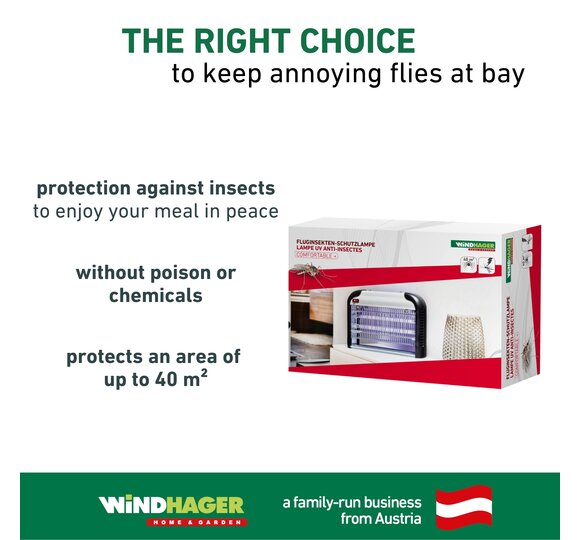 Instead of chemicals, the UVA light is used to attract or kill insects. As soon as the lamp is connected to the mains, it is also ready for use. The protective lamp emits UVA light that is harmless to humans and animals. The electrically charged grid is protected by an aluminium housing, which prevents unintentional access into it. The UV tubes are interchangeable, so a long service life of the product is guaranteed. Original Windhager replacement lamps are also available individually.