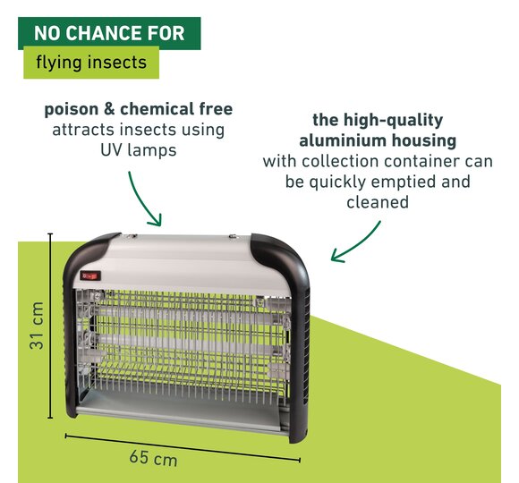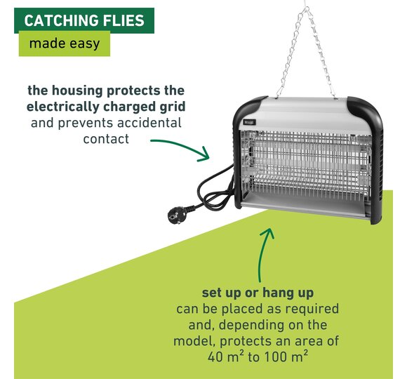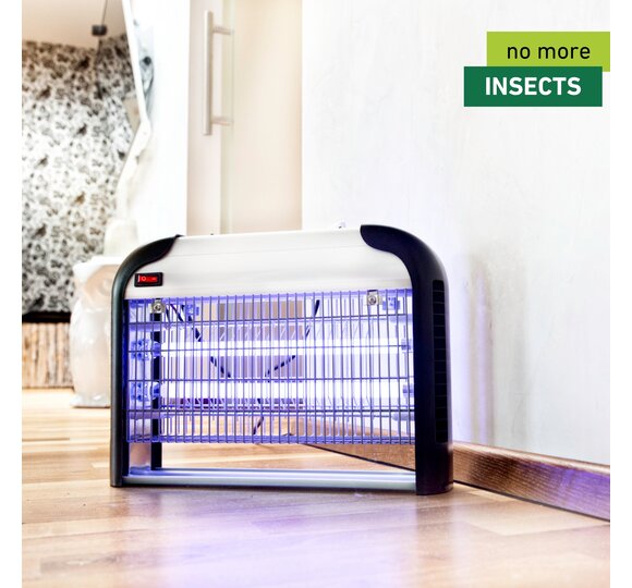The COMFORTABLE + protective lamp puts an end to the plague of flying insects such as flies, mosquitoes and moths indoors. This type of insect control works without the use of poisons or chemicals. The protective lamp is available in two versions, each equipped with two UV lamps. The 8 watt lamp protects an area of up to 40 m2, while the 20 watt lamp protects an interior space up to 80m2. The insects are attracted by the non-toxic, blue UVA light of the lamp and then killed immediately by a short electric shock. Then they fall into the drip tray, which can be easily cleaned. Before doing this, pull out the power plug!