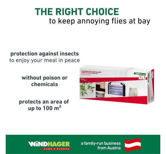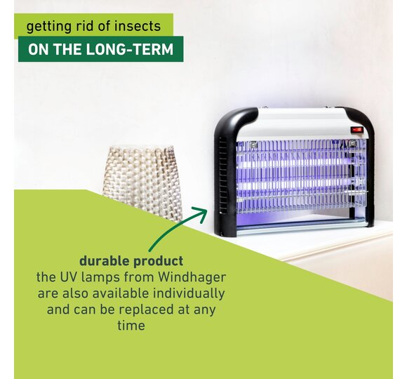 Instead of chemicals, the UVA light is used to attract or kill insects. As soon as the lamp is connected to the mains, it is also ready for use. The protective lamp emits UVA light that is harmless to humans and animals. The electrically charged grid is protected by an aluminium housing, which prevents unintentional access into it. The UV tubes are interchangeable, so a long service life of the product is guaranteed. Original Windhager replacement lamps are also available individually.