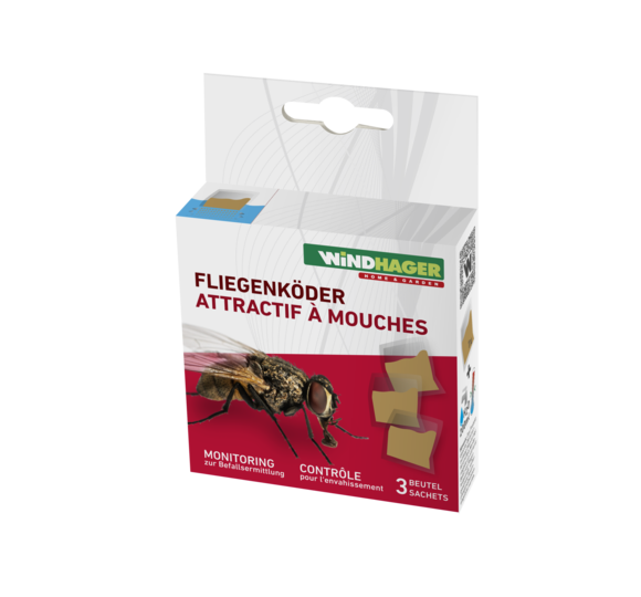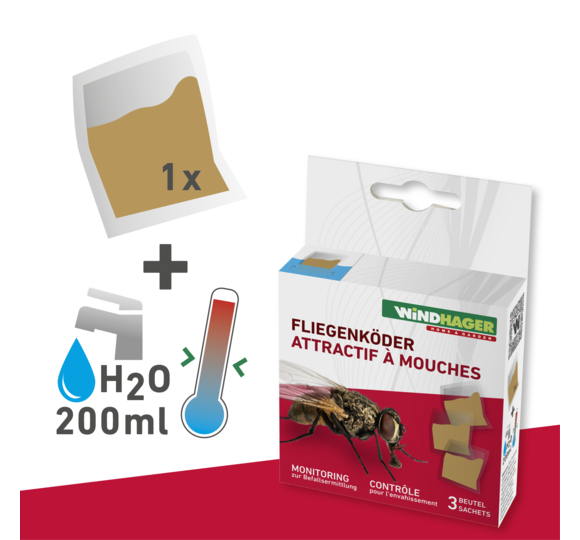 Pour the whole content of one bag into a Windhager trap and add 200ml of water. The trap is then ready for use and can be set up straight away. In a pack there are 3 bags containing the fly bait, which are sufficient for 3 applications. The bait should be replaced after about 6 weeks as it becomes less effective over time.