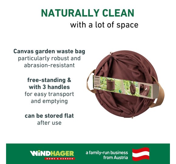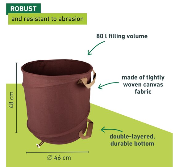 Canvas - also known as sailcloth - is characterized by its particularly high resistance and high abrasion resistance. It's sturdy enough to be used frequently. In addition, the bottom of our garden waste bag is double-layered for safety. The relatively dark colour (brown) of the fabric ensures that the traces of use do not stand out.