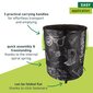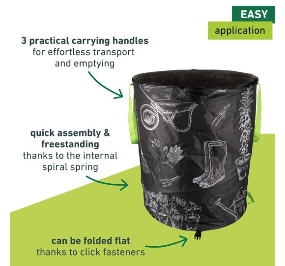 Made of high-quality Oxford 600D fabric, the sturdy garden bag is a useful equipment for every garden owner. With a filling volume of 180 litres, it offers plenty of space for garden waste of all kinds. Thanks to an internal spring, it is quick to set up and can be used freestanding. Three firmly sewn handles make it easy to transport the bag and empty it of collected grass, leaves and prunings. And so that the garden bag can be stored in a space-saving manner after successful use, it can easily be folded flat and securely fastened with the practical click fasteners.