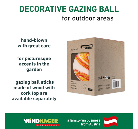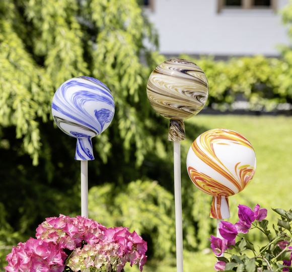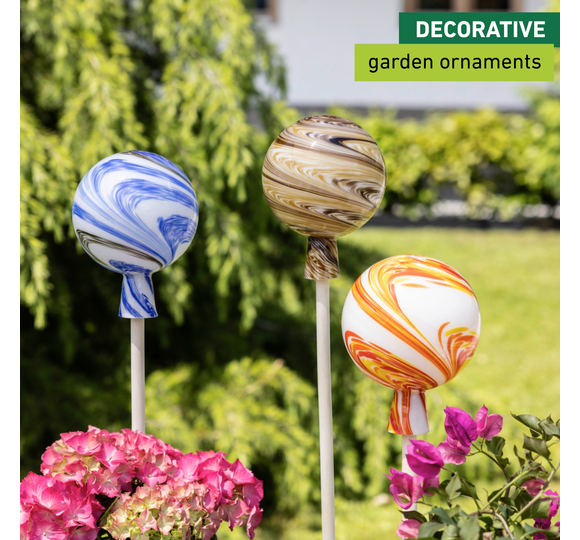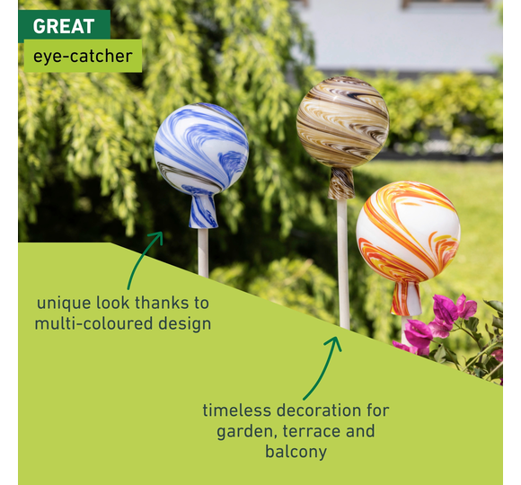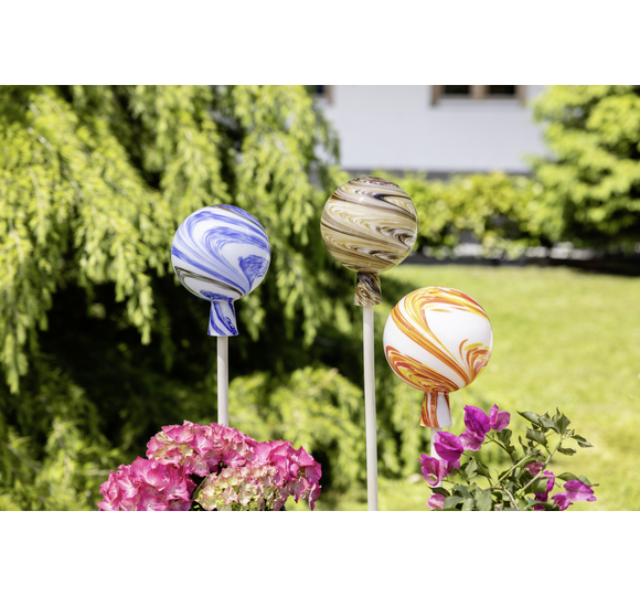 Whether in the flower bed, on the patio or on the balcony, the multi-coloured garden balls provide picturesque colour accents. Each ball is hand-blown with great care, making it truly unique. Thanks to the high-quality coloured glass, the balls are also UV and weather-resistant. The unique design in 3 different colour variations rounds off a timeless garden design.