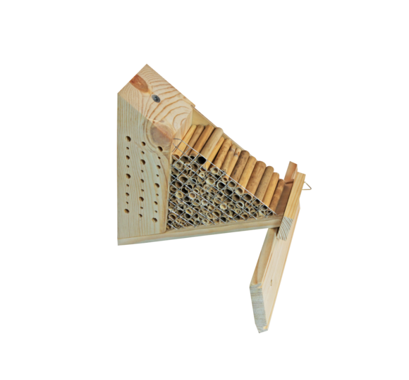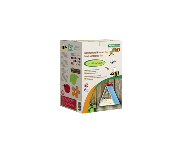 Complete construction kit including colours for painting of the insect hotel. Placed on a weather-protected and sunny location, beneficial insects such as parasitic wasps or wild bees find the possibility to nest.