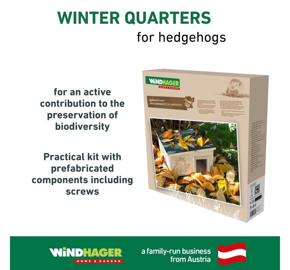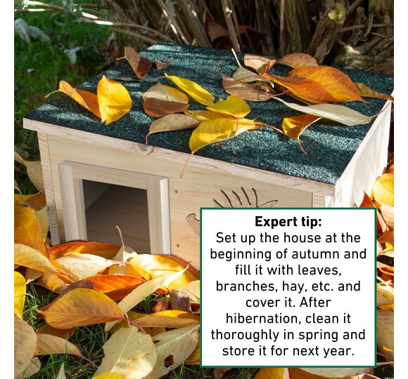 In autumn, hedgehogs try to gain their winter fat and then set off in search of a safe place to hibernate. Therefore, set up the house at the beginning of autumn and fill it generously with leaves, branches, hay or straw. The roof should also be covered with brushwood and branches to make the hedgehog feel at home. Once it has settled in, it goes into hibernation and does not leave the house again until spring. During this time it needs peace and quiet and must not be disturbed. Only in late spring, when the hedgehog has moved out, the house can be cleaned and stowed away until its next use.